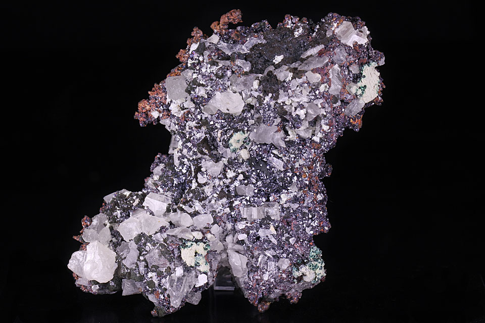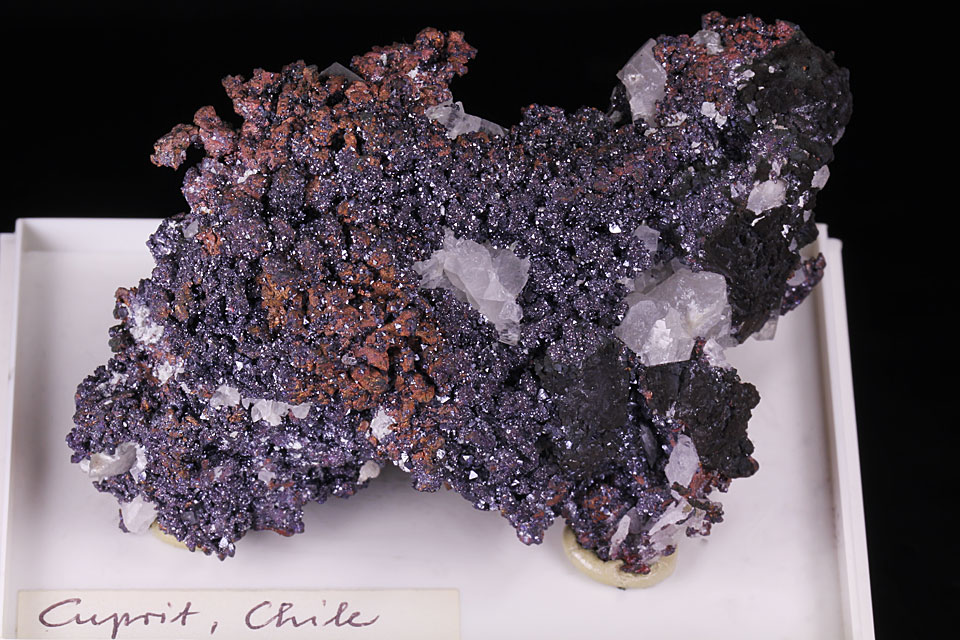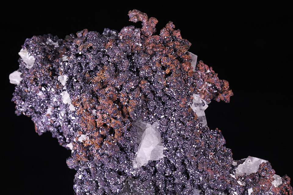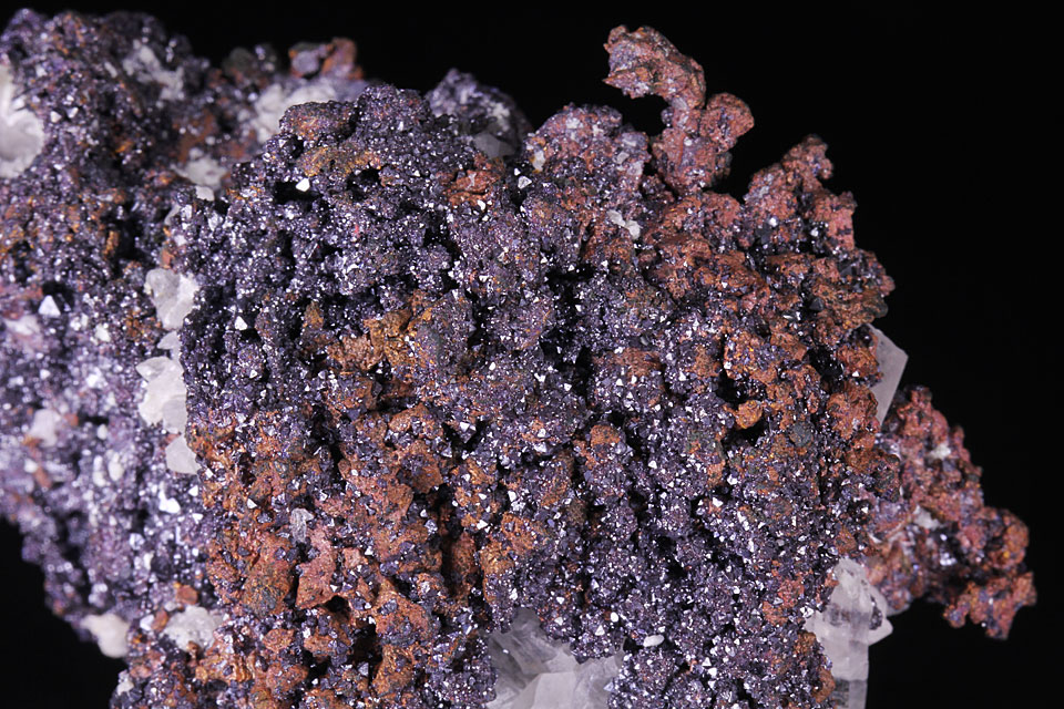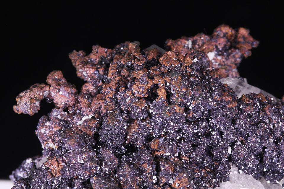 Kleine Handstufe mit vielen dunkel-roten Kristallen auf ged. Kupfer und einer Brekzie aus Bergkristallen. |