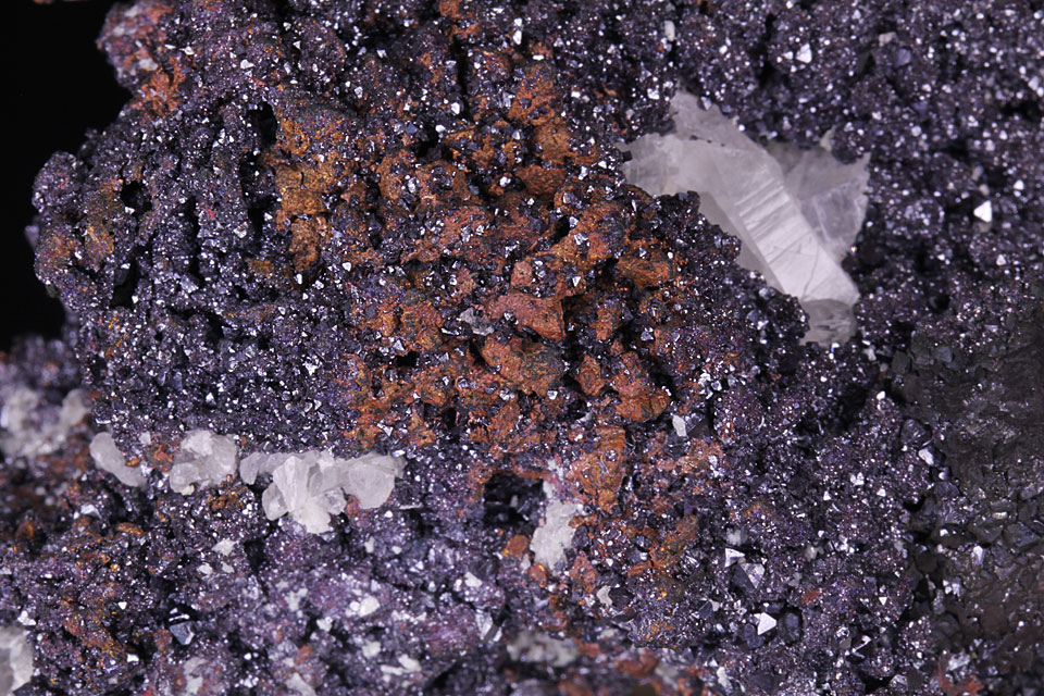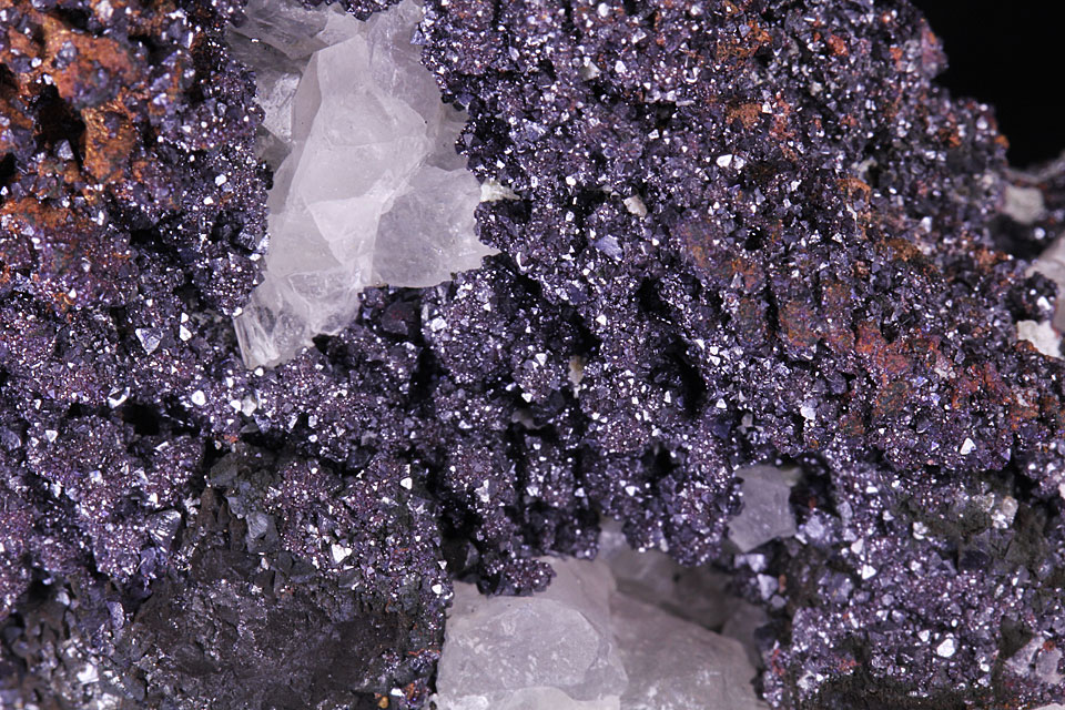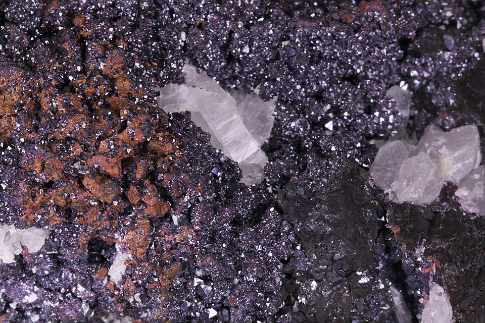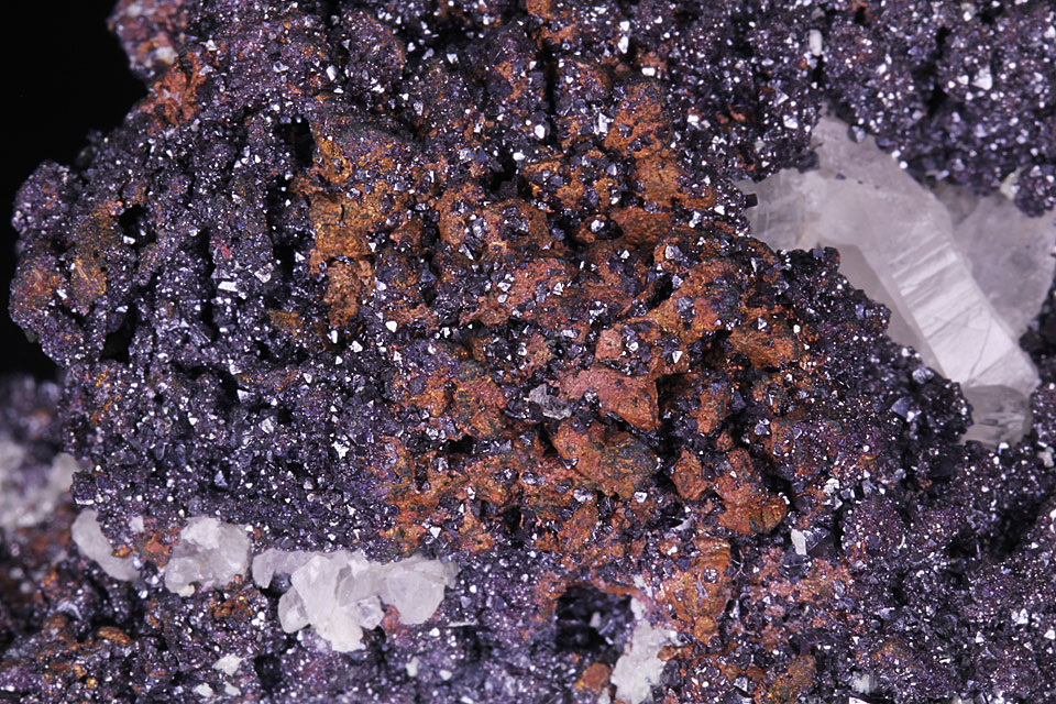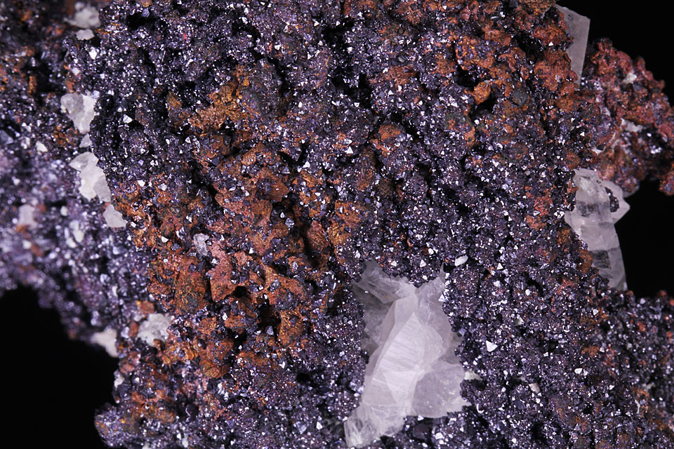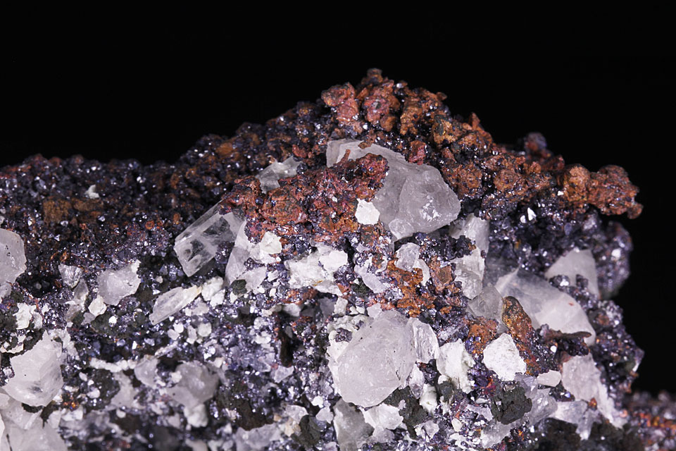 Kleine Handstufe mit vielen dunkel-roten Kristallen auf ged. Kupfer und einer Brekzie aus Bergkristallen. |