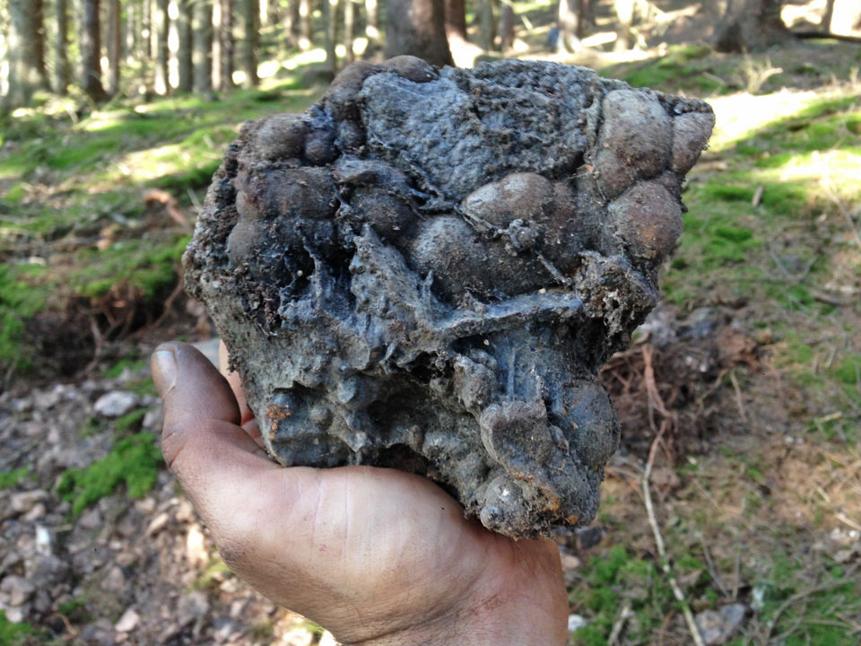 Nach dem mein sehr guter Freund Boris, eine für uns neue Fundstelle, im Siegerland exploriert hatte und sie für gut befunden hatte sind wir am Samstag den 03.10.2015 zusammen dorthin gefahren. Nach recht kurzer Zeit fand Boris auch schon einen echt guten, großen Hydrohämatit. Auch bei mir ließen sich die guten Stücke nicht lange bitten. Nach ca. 30 min hatte ich auch einen sehr guten und großen Hydrohämatit gefunden. Er misst stolze 20 cm. Die nächsten zwei - drei Stunden konnte ich nicht mehr viel finden, wo hingegen Boris immer wieder nette Stücke zu Tage förderte. Ich wollte schon fast aufgeben, als plötzlich ein wunderbarer, bunt angelaufener Hydrohämatit (7 x 4,5 x 4 cm) vor mir lag. Das kleine Handstück zeigte schon dreckig dass es ein Vitrinen Stück werden würde. Weitere zwei Stunden vergingen ohne nennenswerte Funde. Als ich einen vermosten Stein rum drehte konnte ich es kaum glauben, ich hatte eine ca. 17 x 15 cm große Traumstufe mit Hydrohämatit und vielen großen Lepidokrokit – Kugeln in der Hand. So ein gutes Stück habe ich schon sehr lange nicht mehr gefunden. Weitere Stück kamen an diesem Tag keine mehr, aber ich hoffe sehr das wir dort vielleicht noch mahl so viel Glück haben werden. Nach ca. 6 Stunden machten wir uns schwer bepackt, aber glücklich, auf die Heimreise.