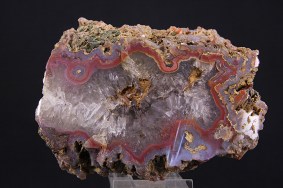 | Info: | Teil einer Mandel zart rosa, mit rot und Quarz. |
