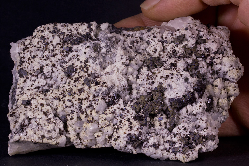 | Info: | Handstufe, sog. Rädelerz auf Quarz mit Zinkblende und Calcit. |