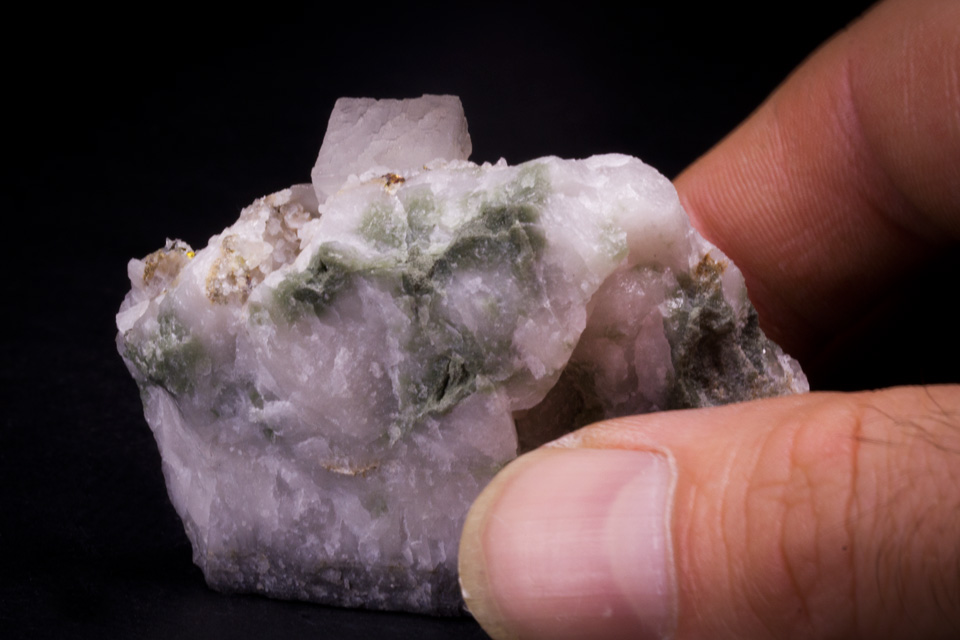 | Info: | Kleine Stufe, Calcit und Kupferkies auf Chloritquarz-Matrix. |