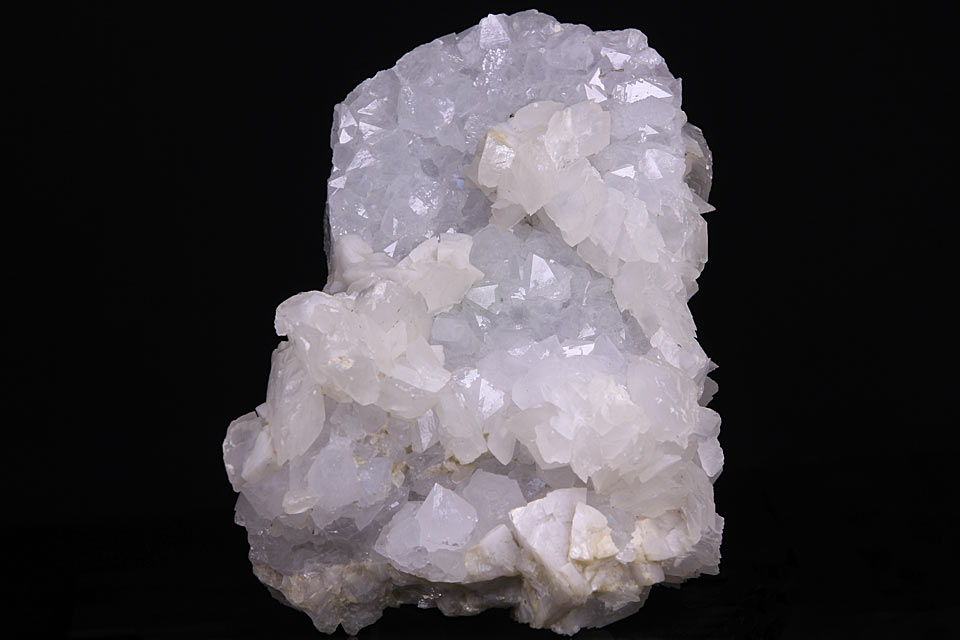 Handstufe, Calcit mit etwas Kupferkies auf Dolomit auf Quarz. Die Calcite sind teilweise stark beschädigt. |