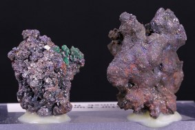 2 Kleine Stufen, ged. Kupfer und Cuprit. Beide Stücke auf einem Sockel. |