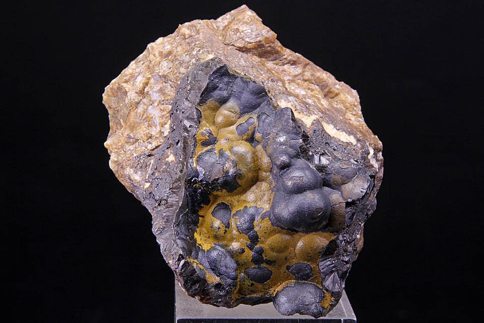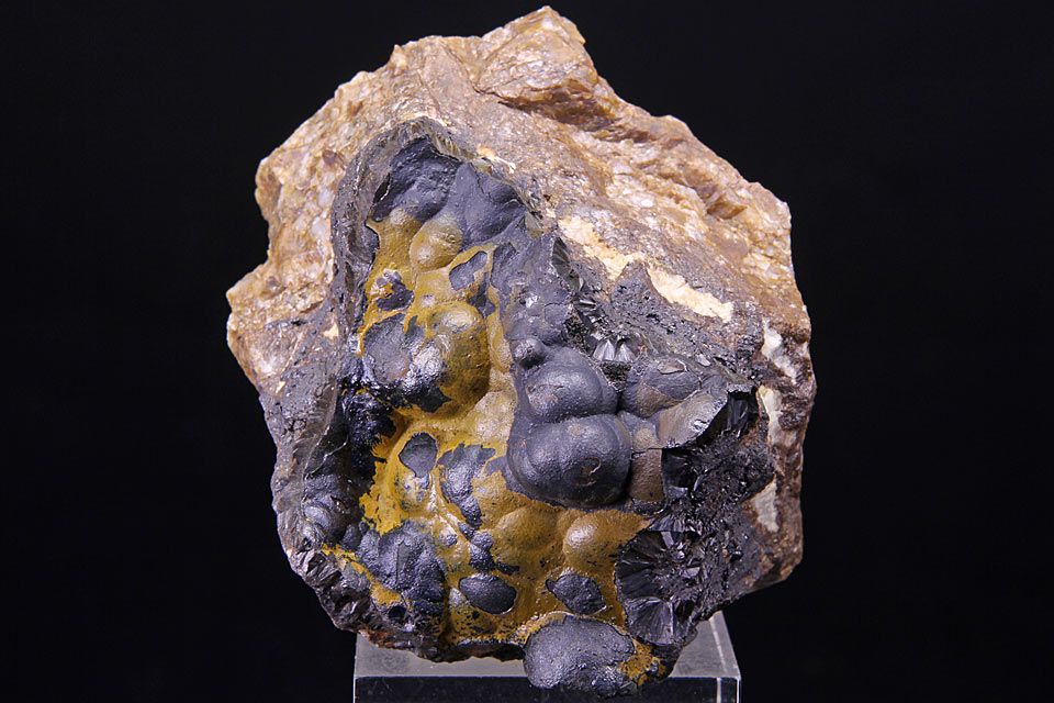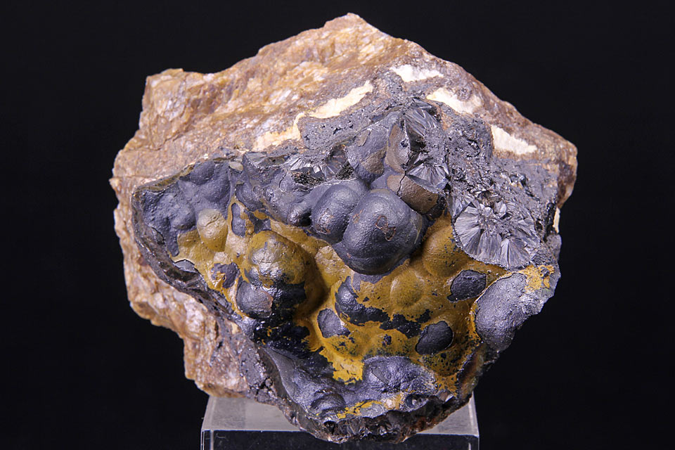 Info: Kleine Handstufe, matter Glaskopf auf Quarzmatrix.