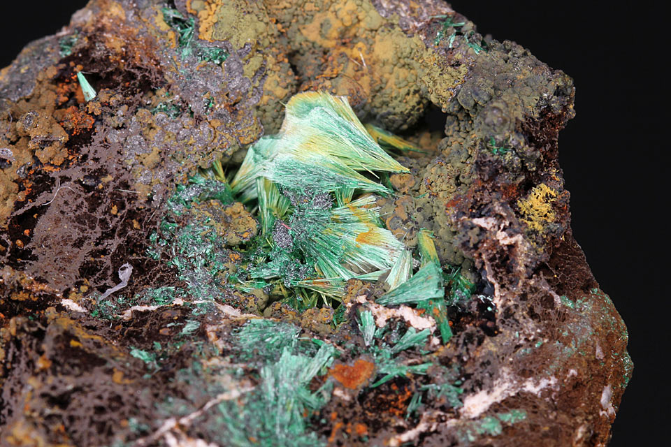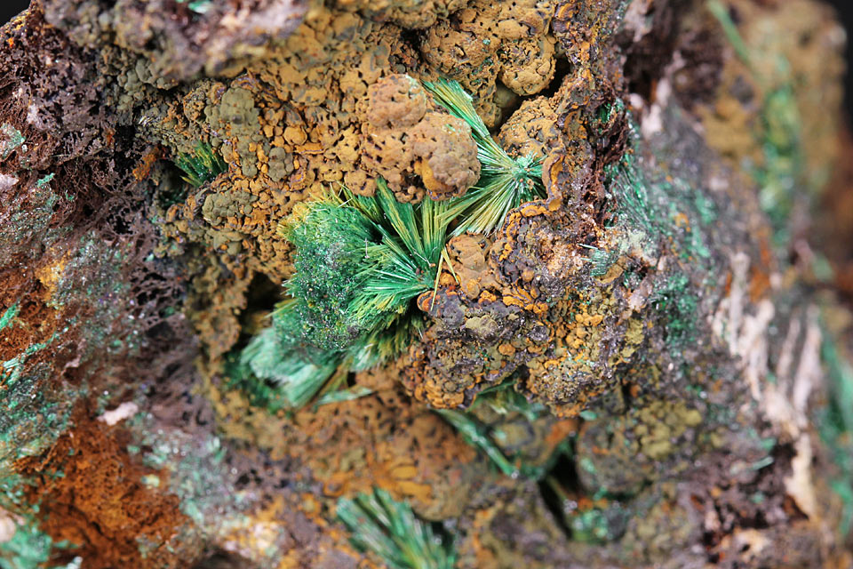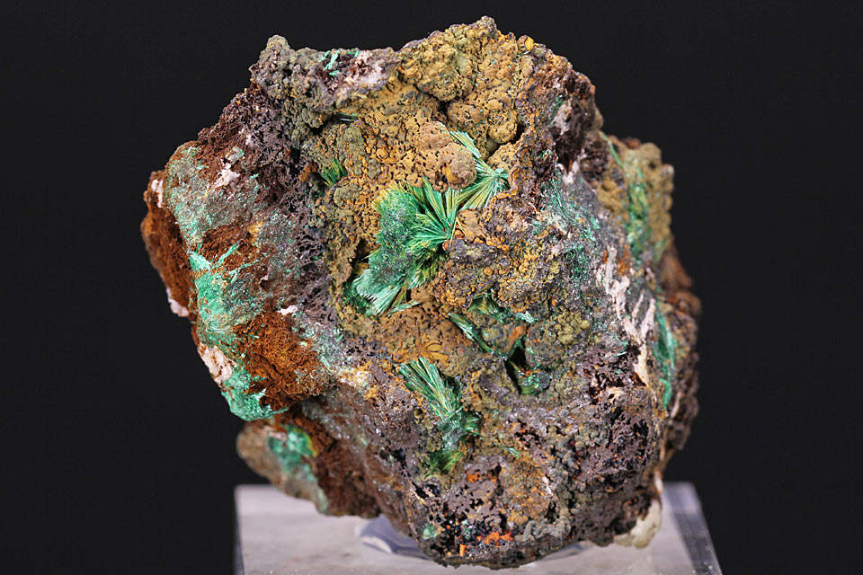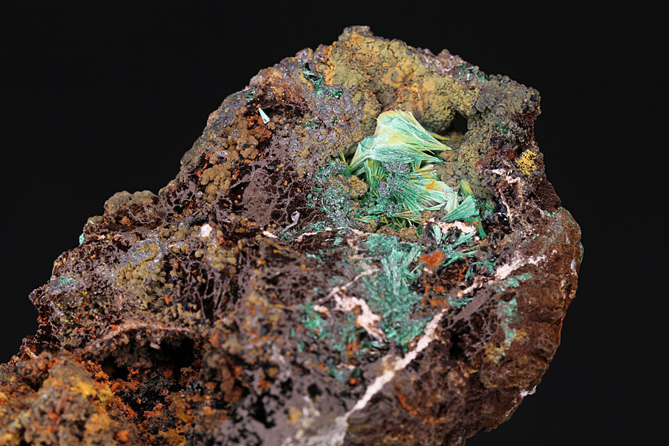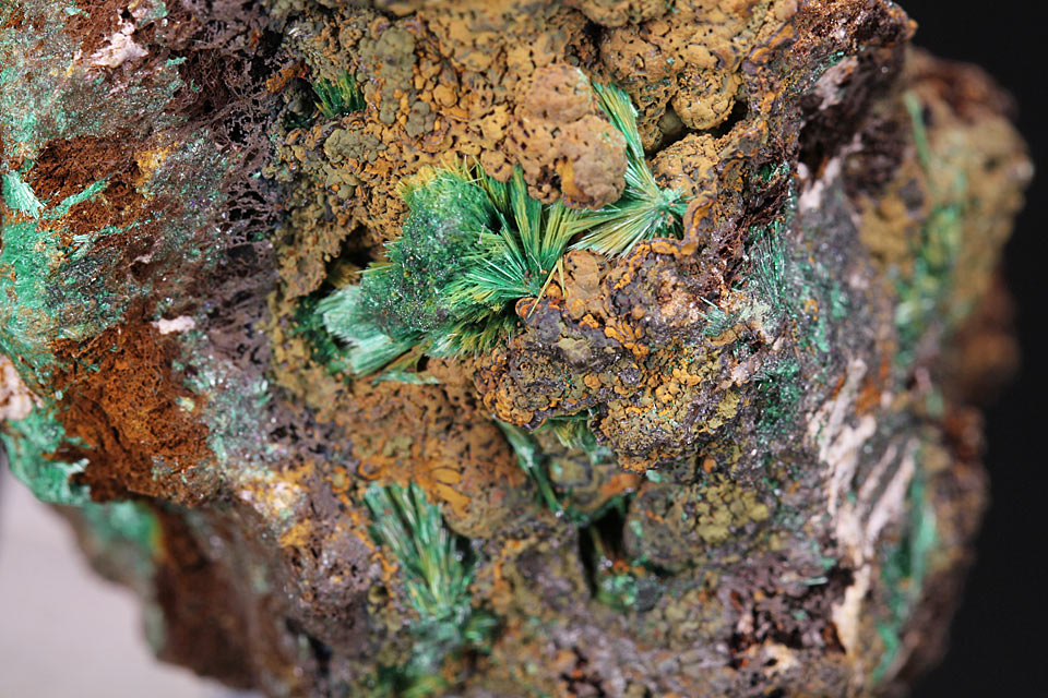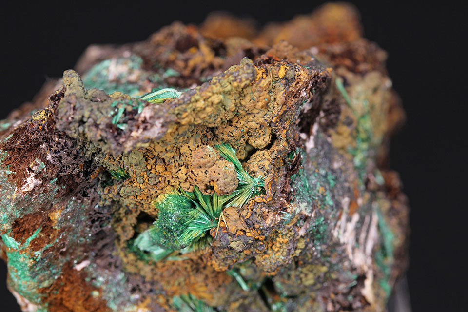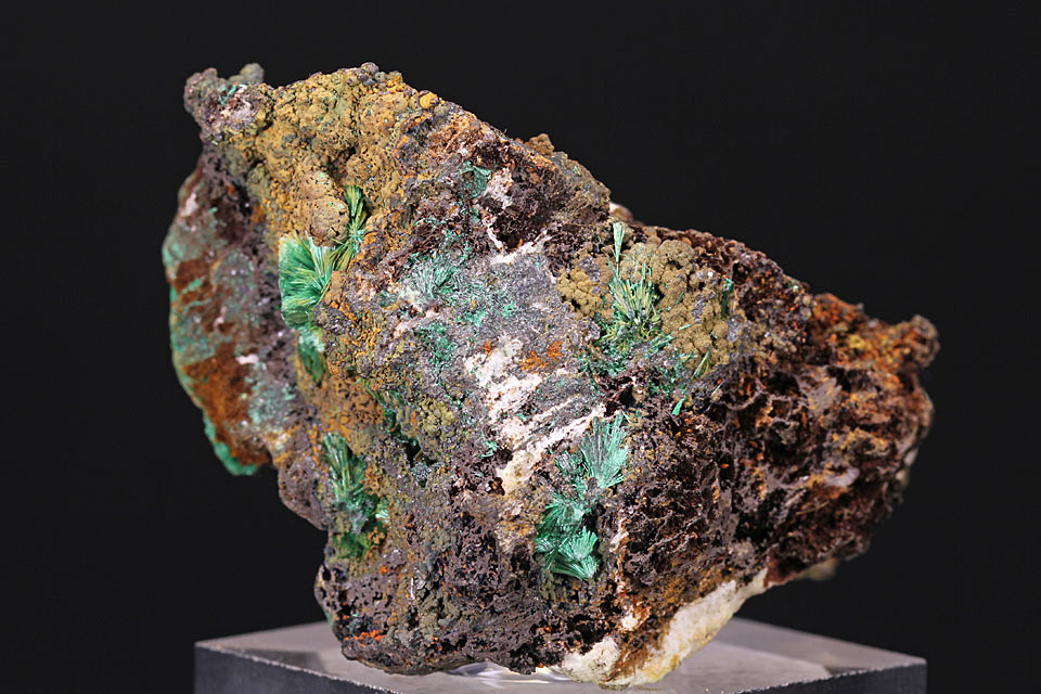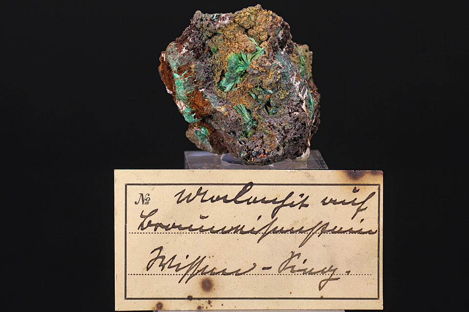 Kleine Stufe, schöner Malachit auf Brauneisen und Ziegelerz.